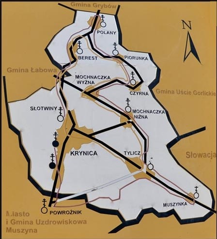 Jest częścią większego szlaku Architektury Drewnianej, daje szanse podziwiania niezwykłych świątyń drewnianych i murowanych cerkwi łemkowskich, położonych na terenie gminy Krynica. Na trasie szlaku można zwiedzać dawne cerkwie grekokatolickie, w większości aktualnie pełniące funkcje kościołów rzymskokatolickich. W obiektach pozostał oryginalny wystrój cerkiewny. Cerkwie zostały zbudowane na przełomie XVIII-XIX wieku, w typie budownictwa zachodnio-łemkowskiego. Szlak przebiega przez Krynicę-Zdrój, Berest, Polany, Piorunkę, Czyrną, Mochnaczkę, Tylicz i Muszynkę.